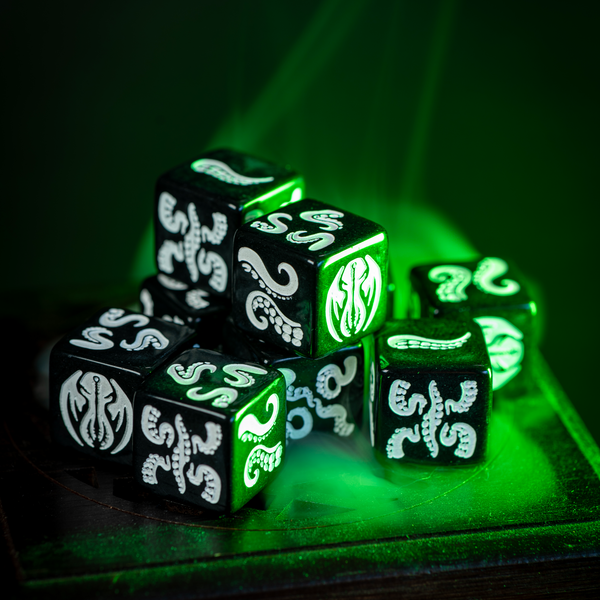 Elder Mythos is a cosmic horror RPG in which players will incarnate frightening Lovecraftian Entities vying to destroy or control the world. Through shared worldbuilding or by choosing a Scenario, players will weave a conversation creating a cosmic horror narrative. With this unique dice set, be ready to live your life as a Lovecraftian entity.